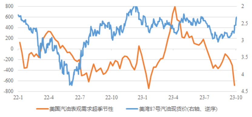 图:美国汽油需求超季节性×美国汽油价格(右轴、逆序)