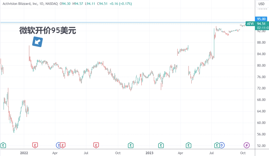 举个投资者都非常熟悉的例子,微软在2022年初给动视暴雪开的收购价为每股95美元,但由于各国监管的态度不明朗,所以动视暴雪在过去两年里有很长一段时间的股价都在70多美元徘徊,直到最近英国监管松口后股价才向着95美元收敛。