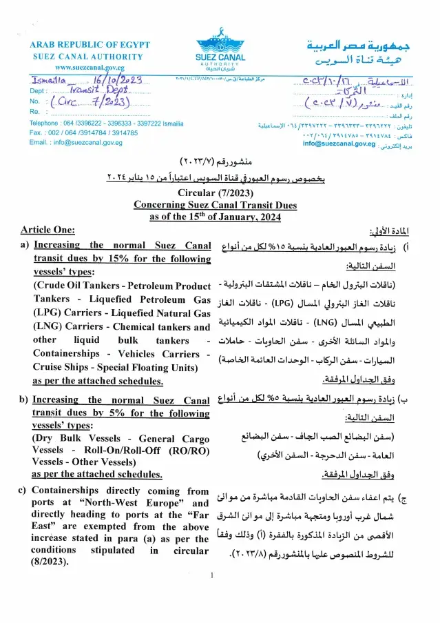声明称,自明年1月15日起,原油运输船、成品油运输船、液化石油气运输船、液化天然气运输船、化学品运输船和其他液体散货船、集装箱船、车辆运输船、游船、特殊浮动设施的通行费将上涨15%。