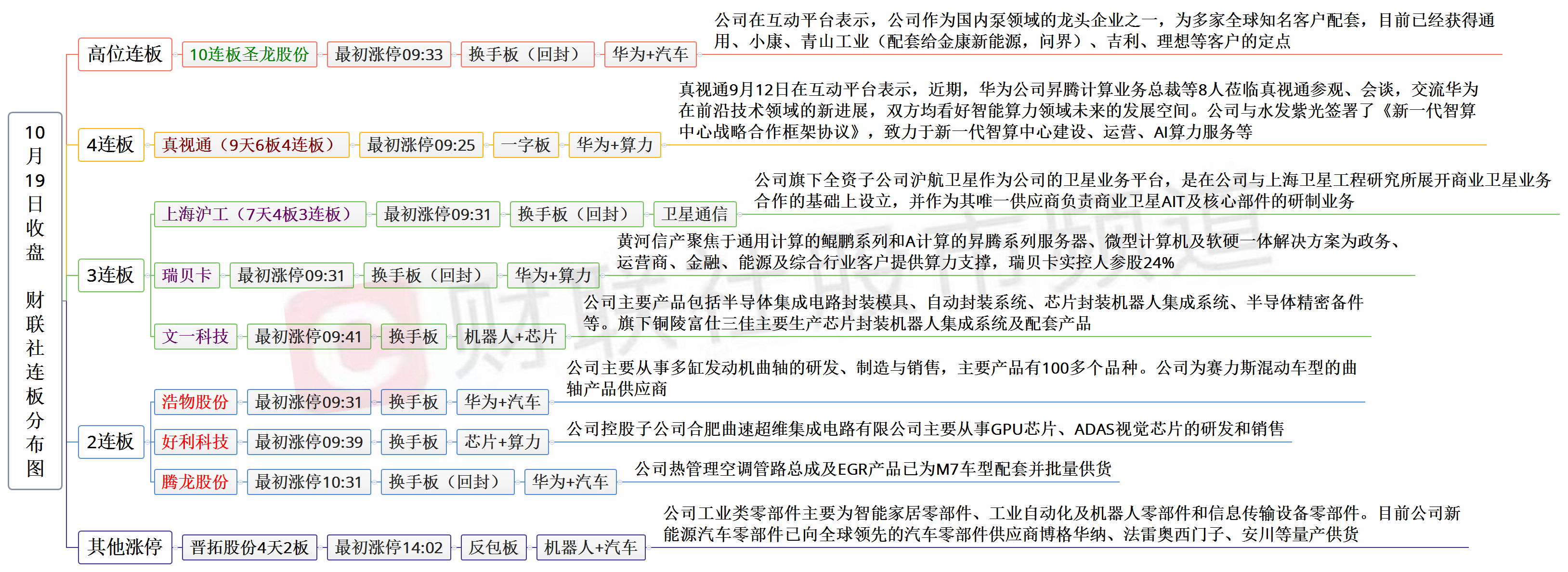 【10月19日连板股分析:高位股大幅补跌 权重股亦表现低迷】今日共26股涨停,连板股总数8只,其中三连板及以上个股5只,上一交易日共9只连板股,连板股晋级率55.55%(不含ST股、退市股及未开板新股)。个股方面,高位股补跌凶猛,常山药业20CM跌停,好上好“准天地板”,恒为科技、万润科技、通化金马等一批热门标的跌停。权重股表现更为低迷,贵州茅台、宝钢股份跌近6%,牧原股份一度跌停。这反映出当前市场情绪低迷,无论游资还是机构都以抛售为主。板块方面,减肥药大幅走弱,双鹭药业、海翔药业、百花医药、德展健康等多股跌停,近日来百花医药、康惠制药、博瑞医药连续受到证监会监管措施,抑制了板块短期炒作的情绪,股价向基本面回归;芯片板块领涨,文一科技3连板、好利科技2连板,易天股份、寒武纪20CM涨停,英伟达芯片出口受限消息持续发酵,叠加芯片市场非常接近周期底部,部分资金尝试提前卡位芯片股。