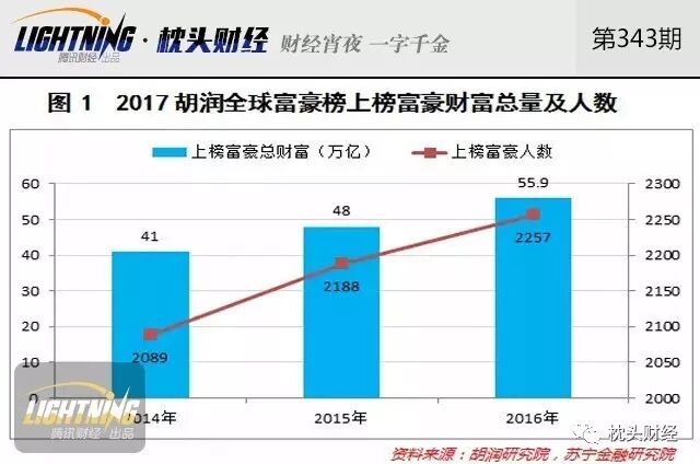 2014年-2016年,全球富豪榜上榜人数趋势性增长,年平均增长率8.3%(参见图1)。从财富总量看,2014年上榜富豪财富总量41万亿人民币, 2015年48万亿人民币, 2016年55.9万亿人民币,年平均增长率16.8%,远超全球GDP 3.2%的增速。