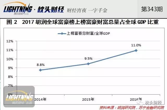 富豪财富总量变化趋势也反映出这一点。2014年上榜富豪财富总量占比全球GDP达到8.8%,超过日本和韩国的GDP总和;2015年上榜富豪财富总量占比全球GDP达到9.5%,超过英国和德国的GDP总和;2016年上榜富豪财富总量占比全球GDP达到11%,接近美国GDP的一半(参见图2)。由此可见,财富集中、存量财富转移和再分配正随着时间的流逝在世界各地上演,存量财富抢夺的时代已经到来。