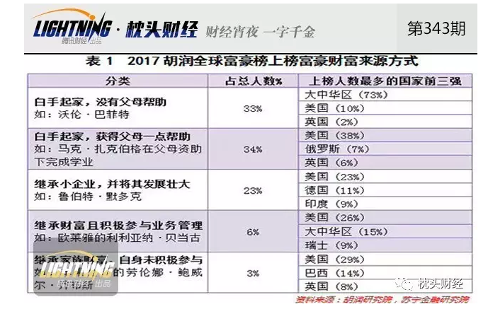 数据显示,上榜的十亿美金富豪中,三分之二是白手起家,三分之一靠继承财产。其中,白手起家的富豪人数,中国最多,占比73%,美国次之,占比48%(参见表1)。由此可见,白手起家才是富豪财富来源的主要方式,靠继承父业发家的还是占少数。