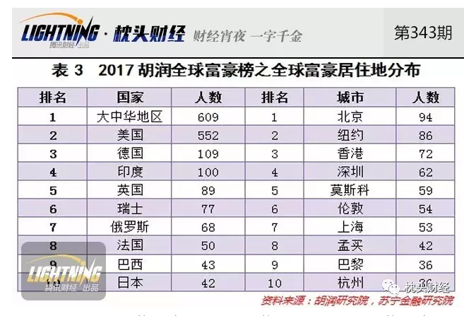 数据显示,在上榜的十亿美金富豪中,大中华区和美国拥有全球一半的十亿美金富豪;大中华区以609位上榜者连续第二年领先于552位的美国(参见表3);北京连续第二年领先纽约蝉联“十亿美金富豪之都”,合计有94位富豪上榜,香港有72位,位列第三,仅次于排名第二的纽约,深圳比去年增加16位,位列第四。毫无疑问,北京、深圳和香港已经成为全球财富的聚集地。因此,创业要去北上广深,那里盛产富豪,当然,北上广深的房价也很高,而且,财富越来越聚集,指不定哪天房价会涨到天上去。