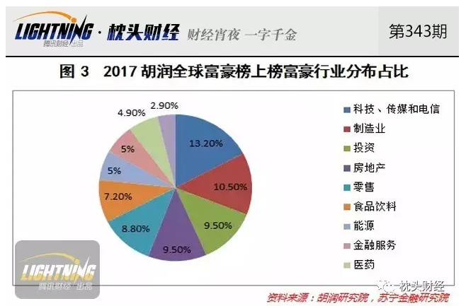 从上榜富豪所处行业看,科技、传媒和电信,制造业和投资业诞生全球十亿美金富豪的数量最多,分别为13.2%、10.5%、9.5%,合计占到总人数的三分之一(参见图3)。