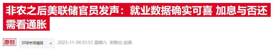 发稿前不久,亚特兰大联储主席博斯蒂克表示,他对非农就业数据感到满意。里士满联储主席巴尔金也评论道,10月份放缓的就业是劳动力市场正常化的可喜迹象,但美联储是否进一步加息更多地取决于通胀报告。