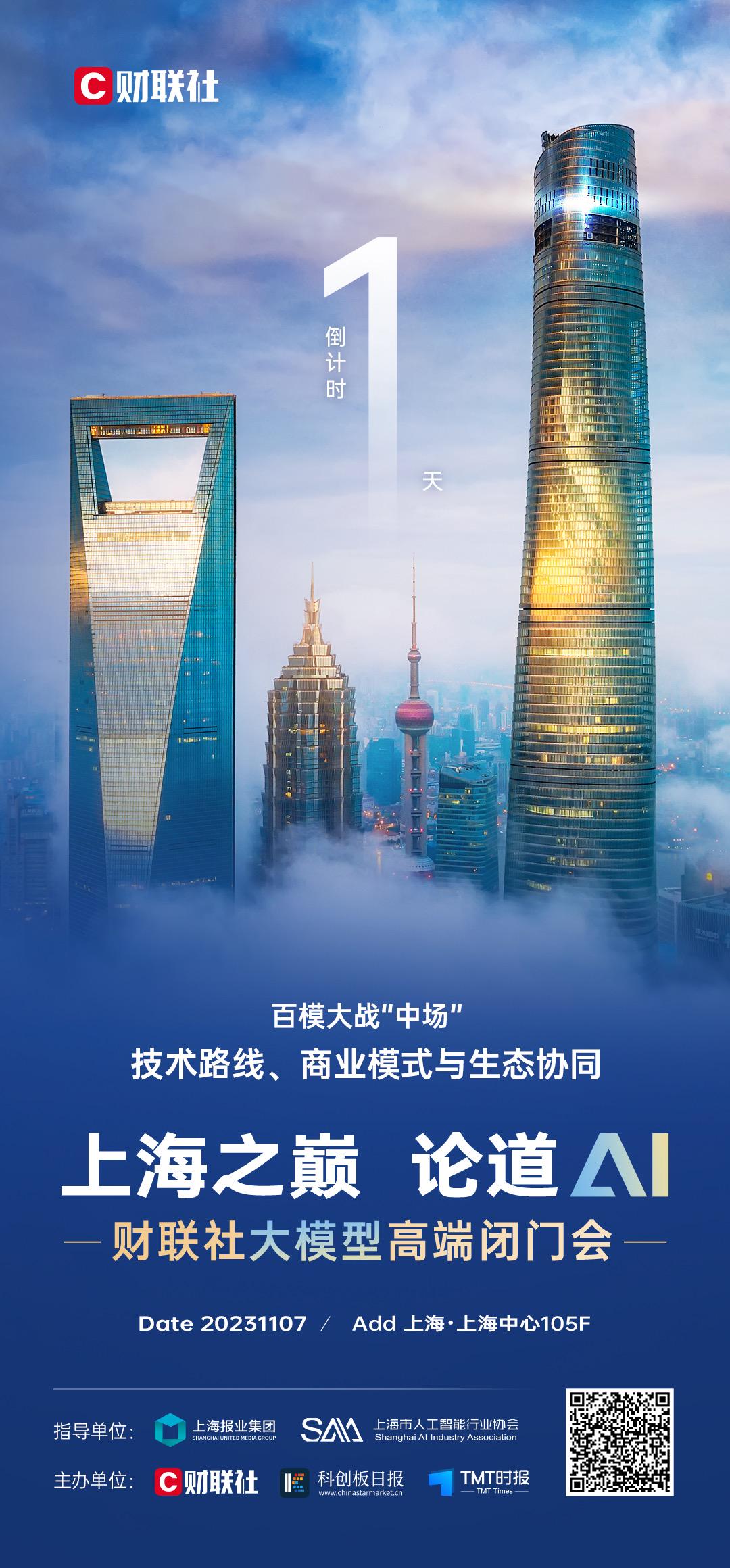 11月7日,由财联社、《科创板日报》与上海市人工智能行业协会牵头合作主办“上海之巅 论道AI”大模型高端闭门会将在上海中心105层举行。