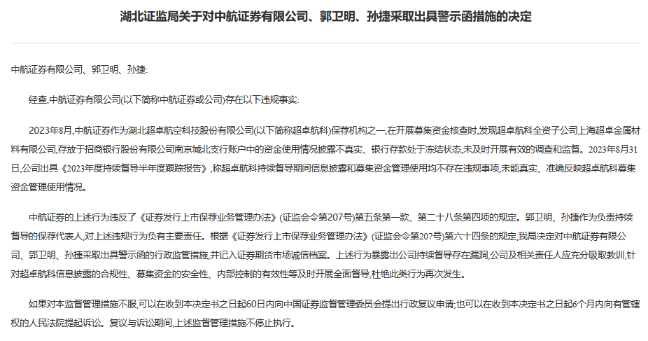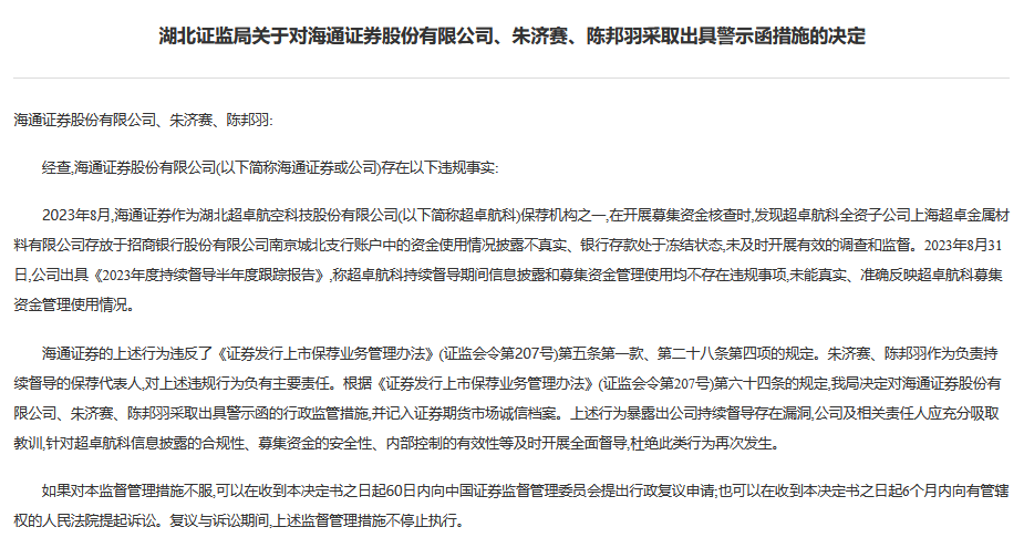 11月21日,上交所、湖北证监局对中航证券及相关保代郭卫明、孙捷,海通证券及相关保代朱济赛、陈邦羽予以警示,作为超卓航科的保荐机构,两家券商持续督导存在漏洞。此前,超卓航科、董事长兼财务总监李光平、总经理李羿含、董秘王诗文就已被上交所、湖北证监局出具警示函,同时被证监会立案调查。