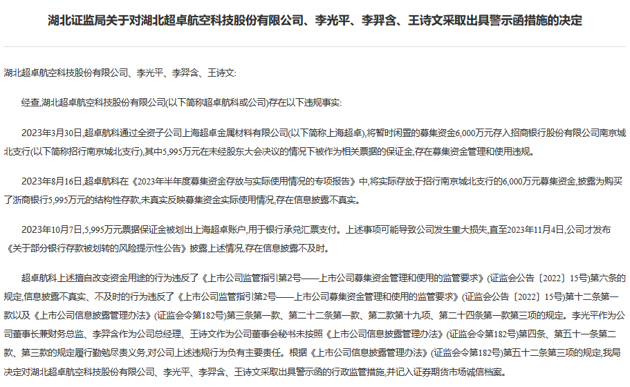 2023年8月16日,超卓航科在《2023年半年度募集资金存放与实际使用情况的专项报告》中,将实际存放于招商银行南京城北支行的6000万元募集资金,披露为购买了浙商银行5995万元的结构性存款,未真实反映募集资金实际使用情况,存在信息披露不真实。对此,超卓航科回应,因为招商银行南京城北支行提供了4%的年化利率,超越了普通存款水平。