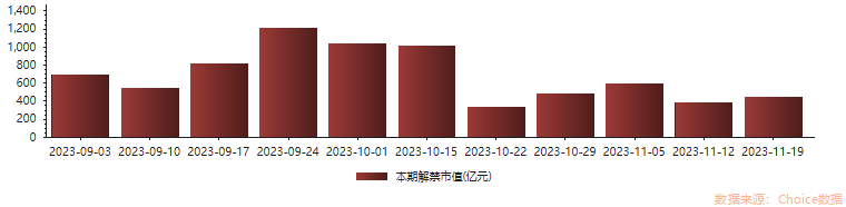 财联社11月25日讯,十一月的最后一周,A股又将迎来千亿解禁洪流。11月27日至12月3日,A股上市公司合计解禁金额约1171.59亿,解禁数量达到40.4亿股。其中,中金公司解禁金额占到818.7亿,北交所曙光数创解禁金额约55.5亿,热门整车厂商北汽蓝谷也有约39.3亿解禁。(按11月24日收盘价计算) 图:2023年9月起至今A股每周解禁市值(亿元)