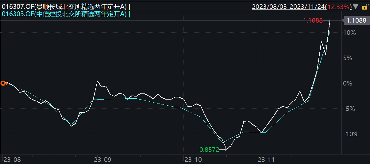 北交所主题基金自然乘势而上,不过相比较恰逢两年封闭期满的首批“北交所精选”系列产品,成立于2022年8月的第二批两只该系列产品,没有抛压,又有行情支撑,上涨的更加“理所当然”。