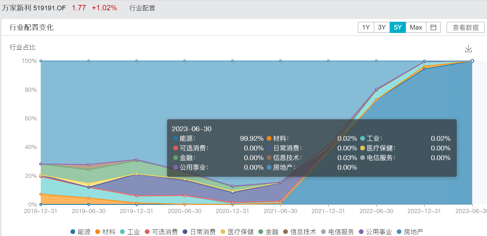 回顾2022年至今,黄海在管基金的持仓行业分布可以清晰的看到,自2022年下半年,他就开始持续增仓能源行业个股,直至2023年二季度末,其持仓个股中,这一比例已高达99.92%,这一集中度甚至可以与已从诺安离任的蔡嵩松相比。