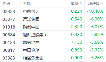 房地产股中,中国恒大(03333.HK)、远洋集团(03377.HK)、融创中国(01918.HK)分别下跌10.40%、6.90%、6.07%。