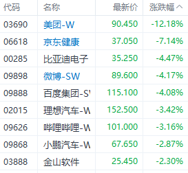 科技股中,美团-W(03690.HK)、京东健康(06618.HK)、比亚迪电子(00285.HK)分别下跌12.18%、7.14%、4.47%。