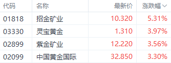 黄金股中,招金矿业(01818.HK)、灵宝黄金(03330.HK)、紫金矿业(02899.HK)分别上涨5.31%、3.97%、3.56%。