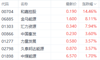 煤炭股中,金马能源(06885.HK)、汇力资源(01303.HK)、中煤能源(01898.HK)分别上涨8.11%、7.94%、1.70%。