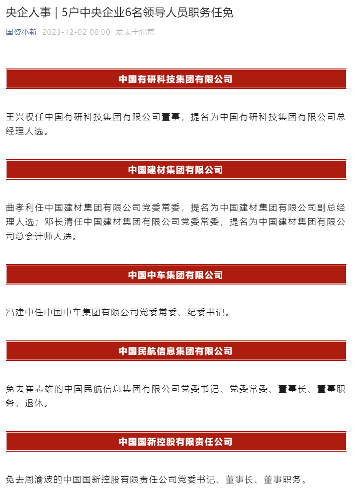 【国资委公布5户中央企业6名领导人员职务任免 包括国新控股、中国中车集团等公司】财联社12月2日电,王兴权任中国有研科技集团有限公司董事,提名为中国有研科技集团有限公司总经理人选。曲孝利任中国建材集团有限公司党委常委,提名为中国建材集团有限公司副总经理人选;邓长清任中国建材集团有限公司党委常委,提名为中国建材集团有限公司总会计师人选。冯建中任中国中车集团有限公司党委常委、纪委书记。免去崔志雄的中国民航信息集团有限公司党委书记、党委常委、董事长、董事职务,退休。免去周渝波的中国国新控股有限责任公司党委书记、董事长、董事职务。