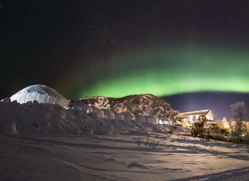 位于挪威、芬兰和俄罗斯三国交界处的挪威希尔科内斯(Kirkenes)镇处于北极圈,是冬季探索极致自然美景、追寻极光不可错多的打卡地,得益于该地区拥有漫长、寒冷的冬季,该地区著名的酒店希尔科内斯雪乡酒店(Kirkenes Snowhotel)提供完全由冰雪建成的冰雪房(仅冬季)和全年开放的山景小木屋。