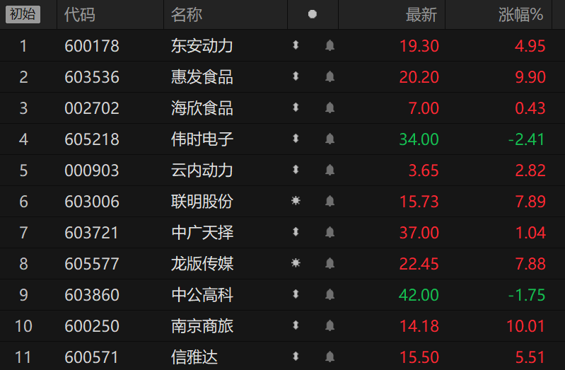 【竞价看龙头:南京商旅一字涨停晋级7连板】财联社12月6日电,市场焦点股东安动力(9板)高开4.95%,食品饮料板块惠发食品(8板)高开9.90%、海欣食品(4天2板)高开0.43%,汽车产业链的伟时电子(11天8板)低开2.41%、云内动力(7天4板)高开2.82%、联明股份(6天3板)高开7.89%,数据要素概念股中广天择(11天8板)高开1.04%、龙版传媒(10天6板)高开7.88%、中公高科(3板)低开1.75%,拥有资产注入预期的南京商旅(6板)竞价涨停,Pika概念股信雅达(4板)高开5.51%。