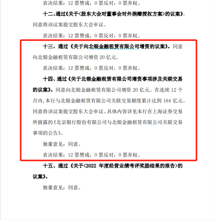 在董事会2023年第八次会议,北京银行通过了《关于北银金融租赁有限公司增资事项涉及关联交易的议案》,同意向北银金融租赁有限公司增资20亿元。