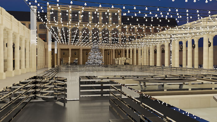 滑冰场的布景设计受到AMI节日胶囊系列的美学启发。镜面镀铬护栏、滑冰场正中央的黑色Ami De Cœur爱心标识、贯穿整个场地的平行装饰灯,都散发着巴黎风情。滑冰场长22米,采用环保设计,由人造自润滑瓷砖制成,无需用到水或者冰。同时,滑冰场一侧的小屋内将开设AMI首家巴黎咖啡厅,并布置圣诞树,以增添节日氛围。