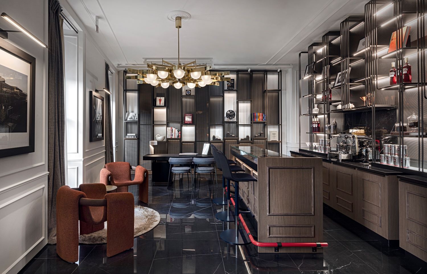 全新专卖店展示了多枚沛纳海标志性的时计作品,踏入店门的陈列柜中展示着意大利Luna Rossa Prada Pirelli帆船队船长兼队长Max Sirena的竞速装备。一楼展示了品牌的历史,楼层中心为“Bar Italiano”,以吧台展柜的形式同时展示腕表,供休闲空间的同时满足选购作品之需。同时由Gio Ponti独家重新打造的Pavone吊灯悬于吧台上方,凸显了品牌的意式基因。丰富的设计陈列及书籍亦凸显出Casa Panerai的舒适宜人。