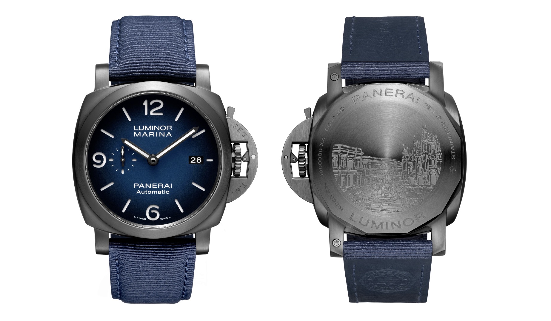 腕表采用44毫米DLC(类钻碳)涂层精钢表壳,表盘9点钟位置设小秒盘,3点钟位置设日期显示,细节处涂覆白色Super-LumiNova夜光涂层,搭载P.9010自动上链机芯。密闭式底盖镌刻米兰大教堂(Duomo)和埃马努埃莱二世长廊(Galleria Vittorio Emanuele II)图案,致敬米兰城地标建筑。PAM02319腕表配备蓝色表带,由再生PET材质制成,其中采用回收再生材料制作的部件重量达7.8克,占表带总重的68%。