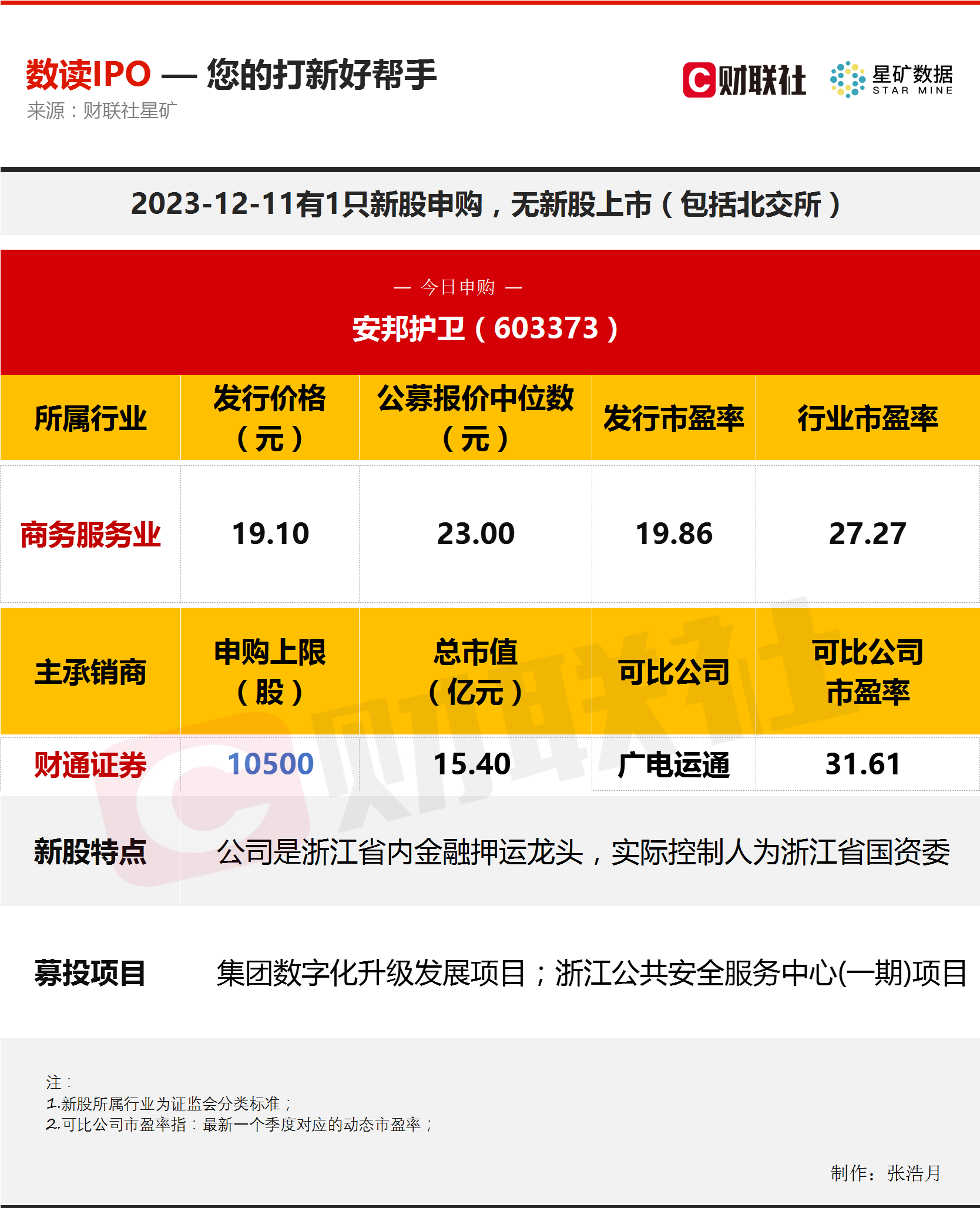 财联社12月11日讯,今日有1只新股申购,为沪市主板的安邦护卫;无新股上市。