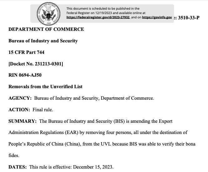【美商务部将四家中国企业移出“未经验证清单”】财联社12月18日电,据美国政府在《联邦公报》(Federal Register)上发布的信息,一份由美国商务部工业与安全局(Bureau of Industry and Security)拟于12月19日发布的文件显示,工业与安全局修订美国《出口管理条例》(EAR),将4家中国公司移出“未经验证清单”(UVL),包括承德奥斯力特电子科技有限公司(Chengde Oscillator Electronic Technology Co.)、中国第二重型机械集团公司(China National Erzhong Group)、宁波大艾激光科技有限公司(Ningbo III Lasers Technology Co., Ltd.)以及新疆东方希望新能源有限公司(Xinjiang East Hope New Energy Company Ltd.),这一修订自12月15日起生效。
