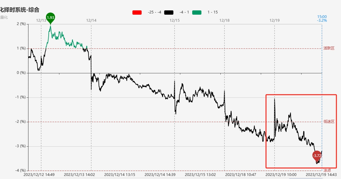 指标显示,今早短线情绪大幅低开后,受到高位股持续补跌拖累下继续震荡探底并跌破低迷区。尽管部分消费电子方向人气股维持活跃态势,但午后高位股的退潮势头进一步加剧,拖累短线情绪尾盘进一步探底并以逼近冰点区报收。