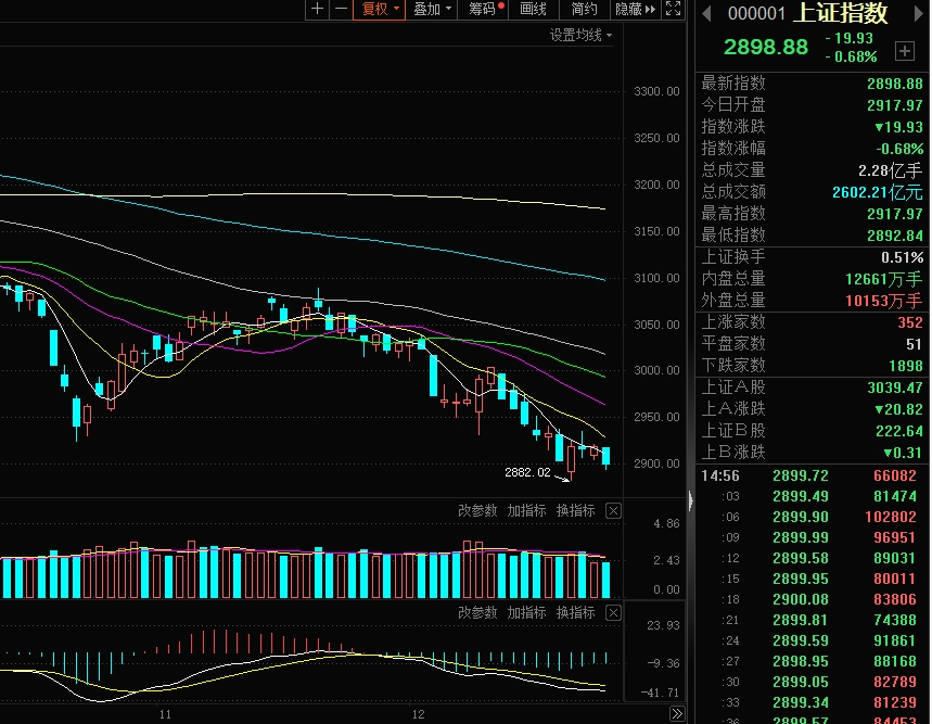 三大股指早盘小幅低开后延续震荡探底行情,磷化工、煤炭等顺周期方向短暂拉升,加上光伏、储能等新能源赛道尝试拉升带动人气。但混合现实概念独木难支,AI产业链以及半导体等泛科技方向仍然欲振乏力,拖累科创50指数再创历史新低。午后券商板块局部异动,华林证券一度逼近涨停,但同样未能带动市场修复,尾盘沪指失守2900点大关。沪深两市今日成交额6099亿,较上个交易日放量18亿。截至收盘,沪指跌0.68%,深成指跌1.07%,创业板指跌1.26%。沪深股通因圣诞节假期今日暂停交易。