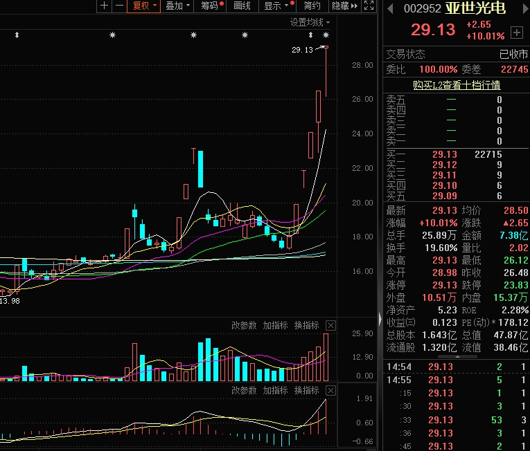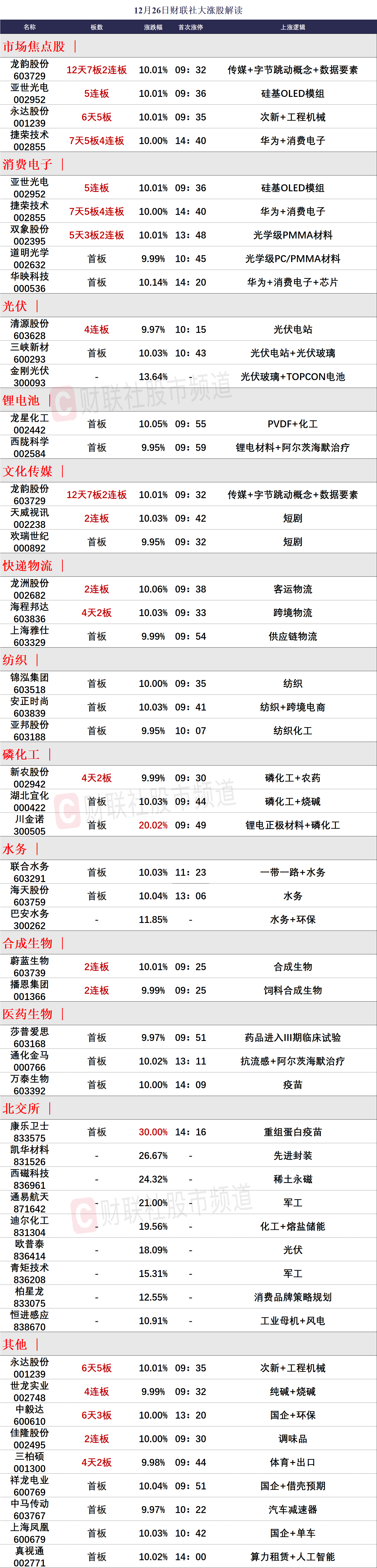 财联社12月26日讯,今日38股涨停,10股炸板,封板率为79%,亚世光电5连板,清源股份、世龙实业4连板,*ST越博20CM2连板,天威视讯、蔚蓝生物、佳隆股份、播恩集团2连板,永达股份6天5板,捷荣技术7天5板,中毅达9天4板,龙韵股份4天3板,双象股份5天3板,海程邦达、新农股份、三柏硕4天2板,川金诺 20CM首板,北交所康乐卫士30CM首板。盘面上,两市超4400家个股下跌;板块方面,磷化工、PEEK材料、贵金属、环保等板块涨幅居前,CPO、数据要素、多模态、存储芯片等板块跌幅居前。