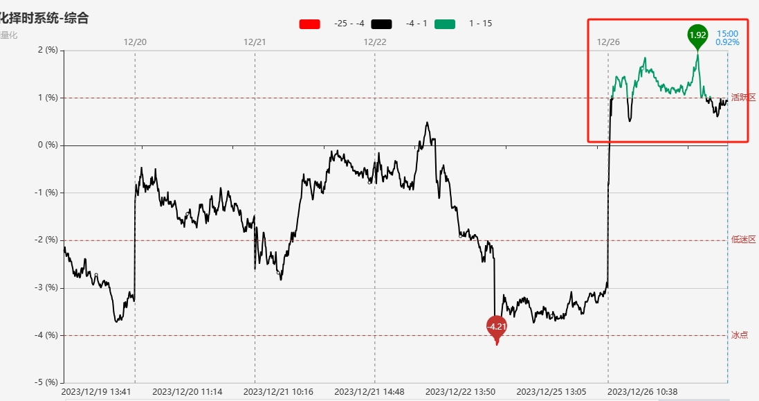 指标显示,今早短线情绪在多只高位人气股走强带动下迅速回升突破活跃区。尽管全天两市下跌个股占据绝对上风,但资金集中于龙字辈以及部分高位人气个股中。尽管午后股指加速下行拖累短线情绪冲高回落,但最终仍报收于活跃区附近,与股指全天单边探底形成背离。
