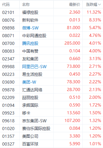 互联网股中,微博-SW(09898.HK)、腾讯控股(00700.HK)、阿里巴巴-SW(09988.HK)分别上涨5.47%、4.01%、2.71%。