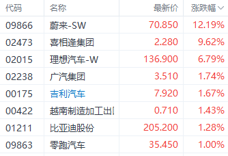 汽车股中,蔚来-SW(09866.HK)、理想汽车-W(02015.HK)、吉利汽车(00175.HK)分别上涨12.19%、6.79%、1.67%。