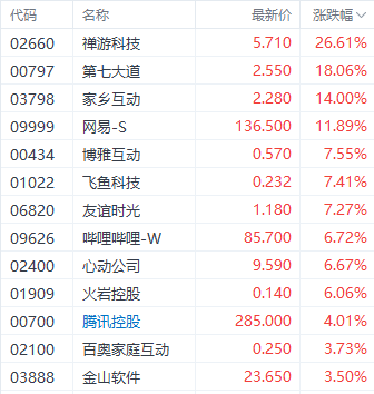 以上措施提振市场信心,这也令上周五集体下挫的游戏股多数反弹,其中禅游科技(02660.HK)、网易-S(09999.HK)、哔哩哔哩-SW(09626.HK)分别上涨26.61%、11.89%、6.72%。