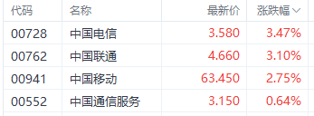 电信股中,中国电信(00728.HK)、中国联通(00762.HK)、中国移动(00941.HK)分别上涨3.47%、3.10%、2.75%。