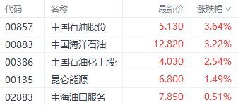 石油股中,中国石油股份(00857.HK)、中国海洋石油(00883.HK)、中国石油化工股份(00386.HK)分别上涨3.64%、3.22%、2.54%。