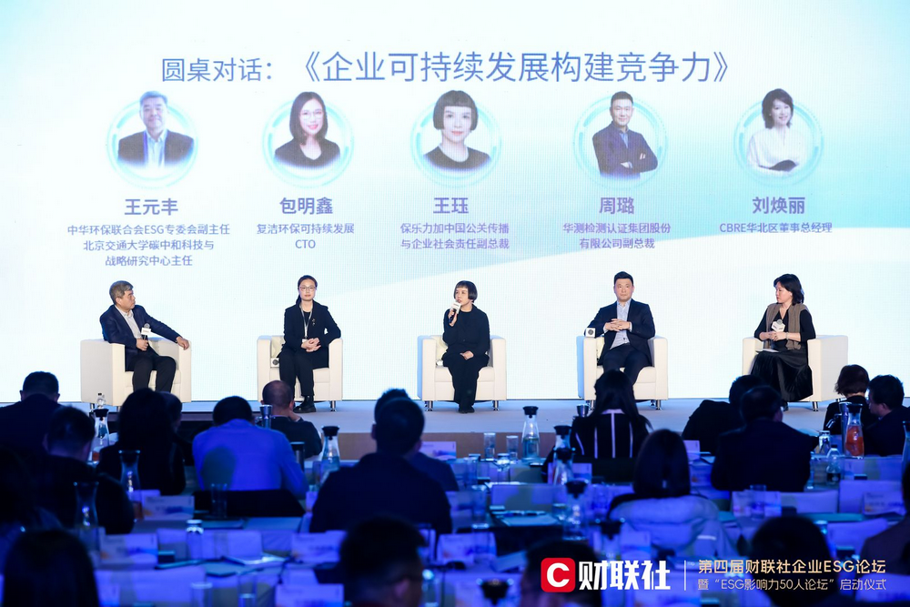 12月27日下午,复洁环保可持续发展CTO包明鑫、保乐力加中国公关传播与企业社会责任副总裁王珏、华测检测认证集团股份有限公司副总裁周璐、CBRE(世邦魏理仕)华北区董事总经理刘焕丽等嘉宾齐聚2023年财联社企业ESG论坛的圆桌会议。