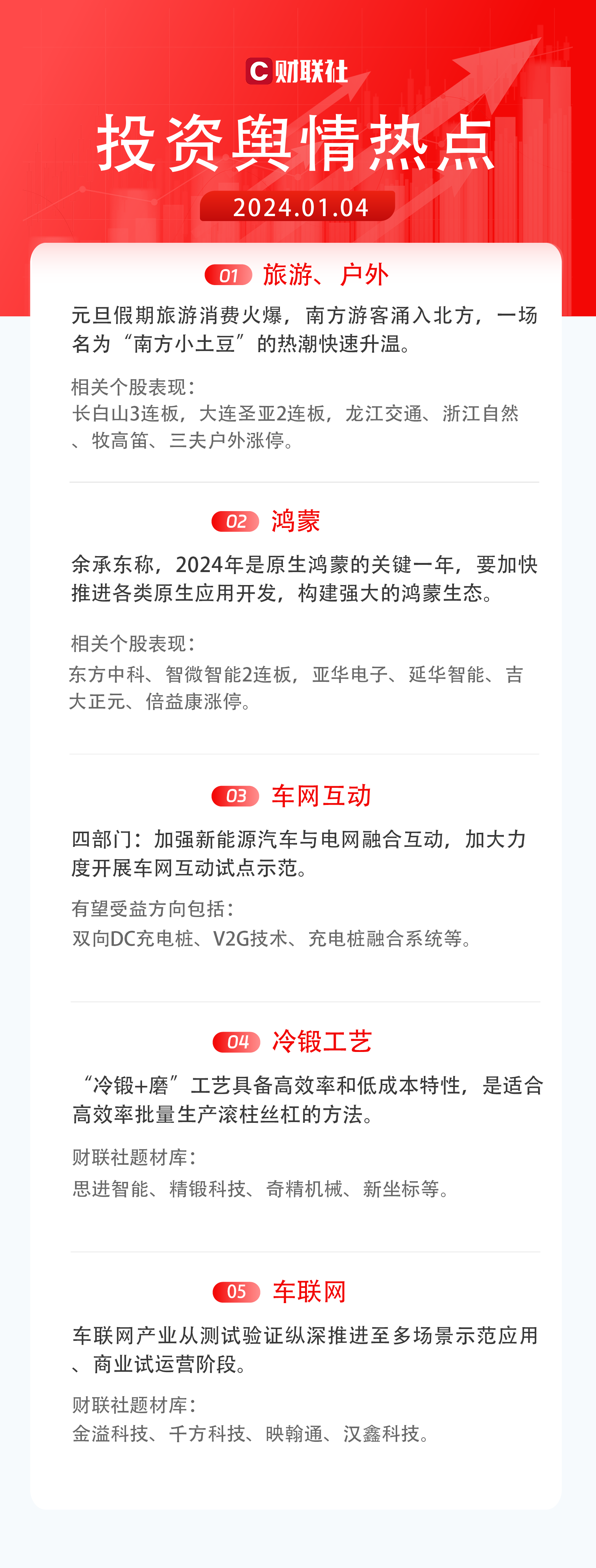 1)旅游、户外:元旦假期旅游消费火爆,南方游客涌入北方,一场名为“南方小土豆”的热潮快速升温。