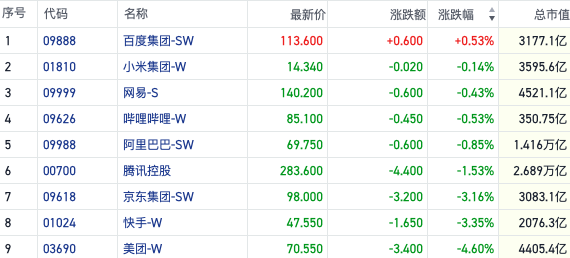 今日盘面上,大型科技股全线下跌,美团跌4.6%继续刷新阶段低价,快手、京东跌超3%,腾讯、阿里巴巴、网易均走低。