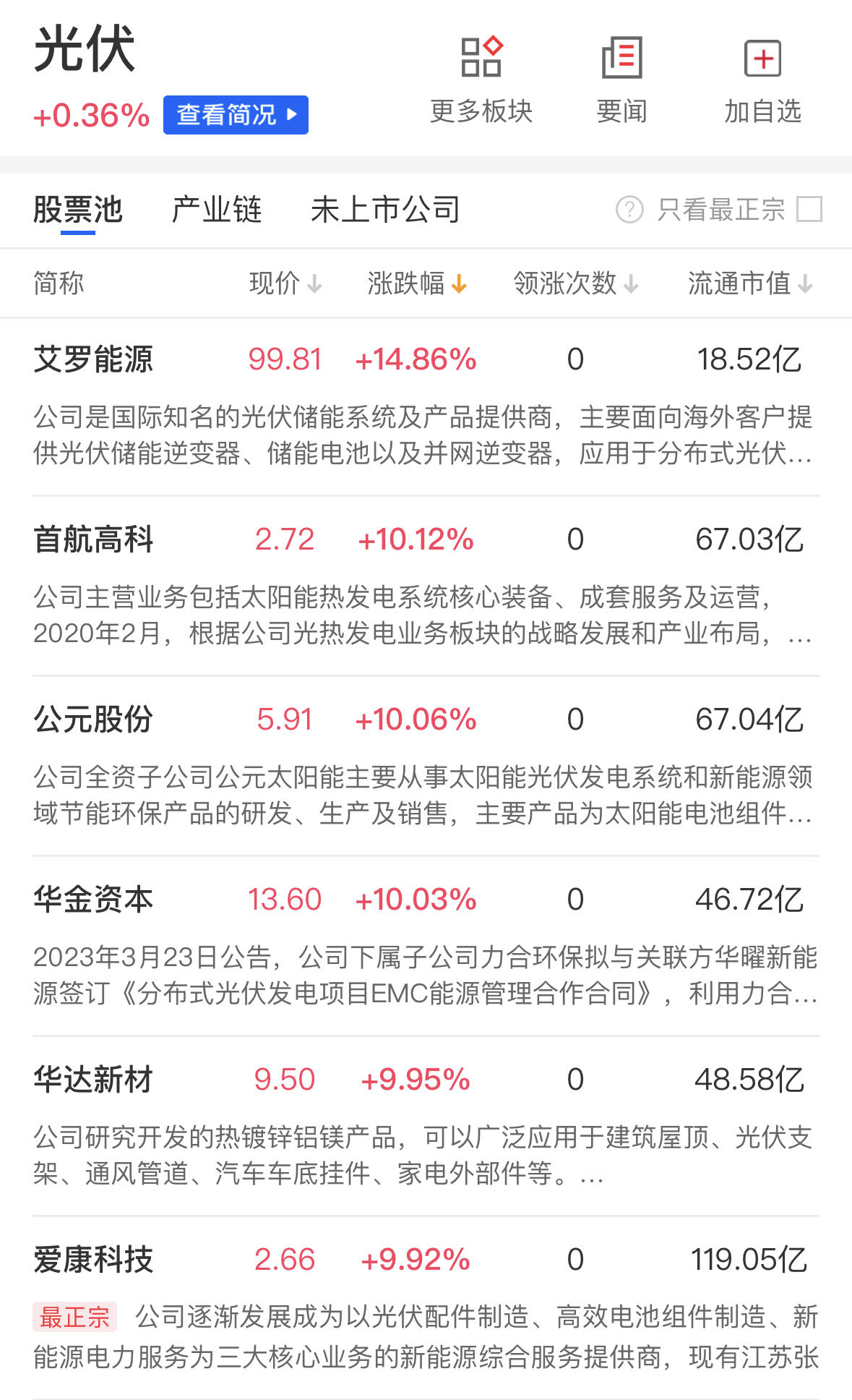 板块上,光伏板块持续活跃,其中爱康科技、公元股份2连板,首航高科涨停,艾罗能源、德业股份、帝科股份、固德威等个股涨幅居前。