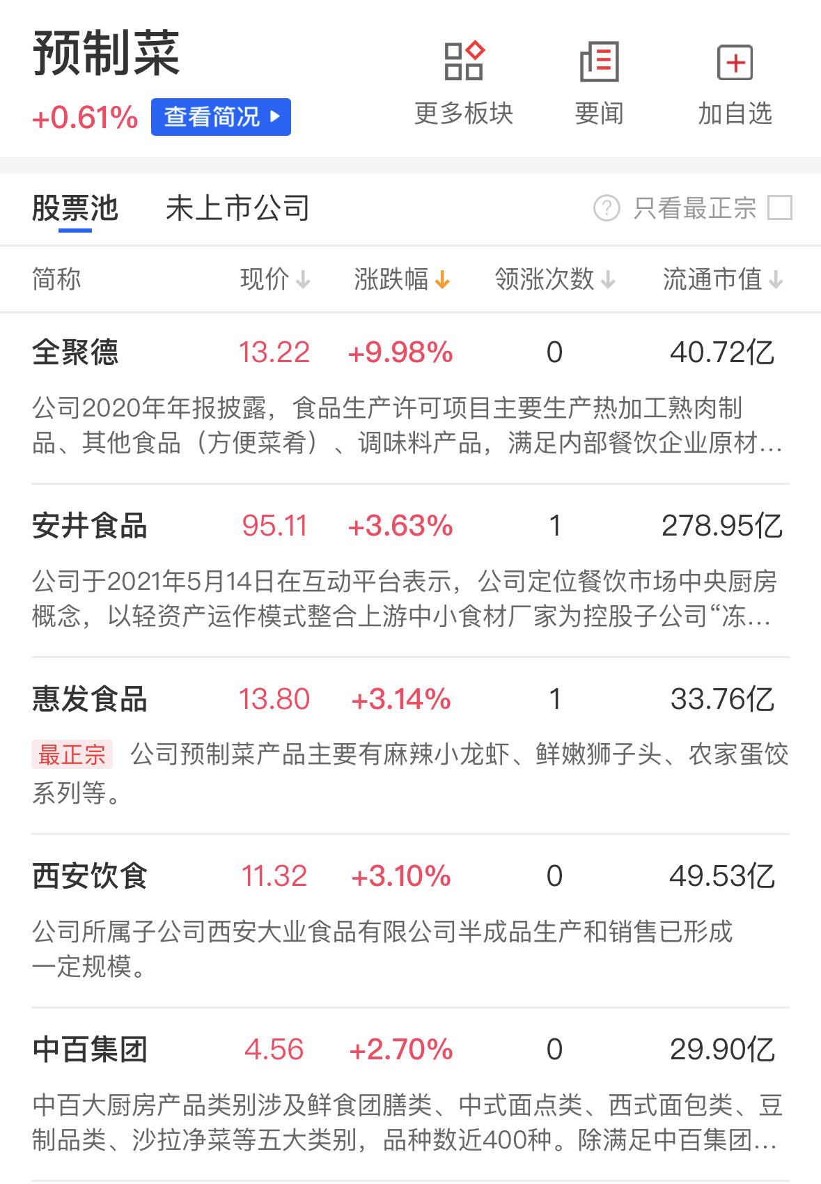 预制菜概念股盘中异动,全聚德涨停,武商集团、安井食品、人人乐、宝立食品、惠发食品等个股涨幅居前。