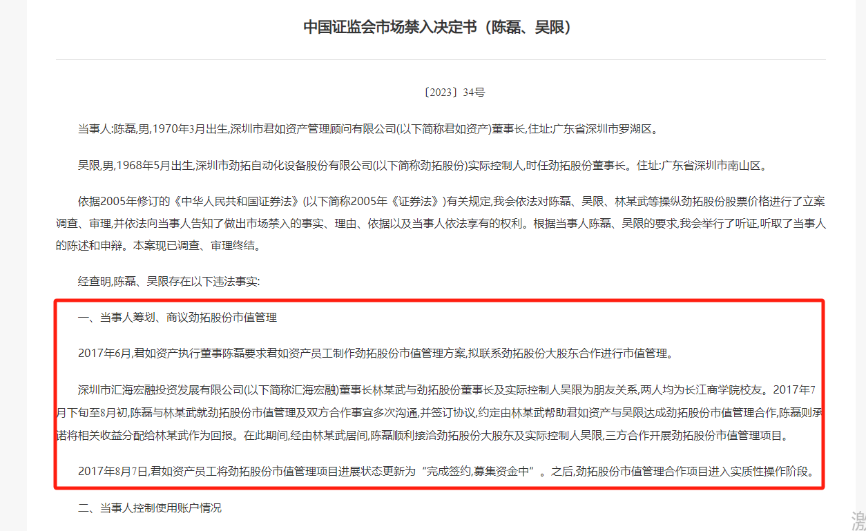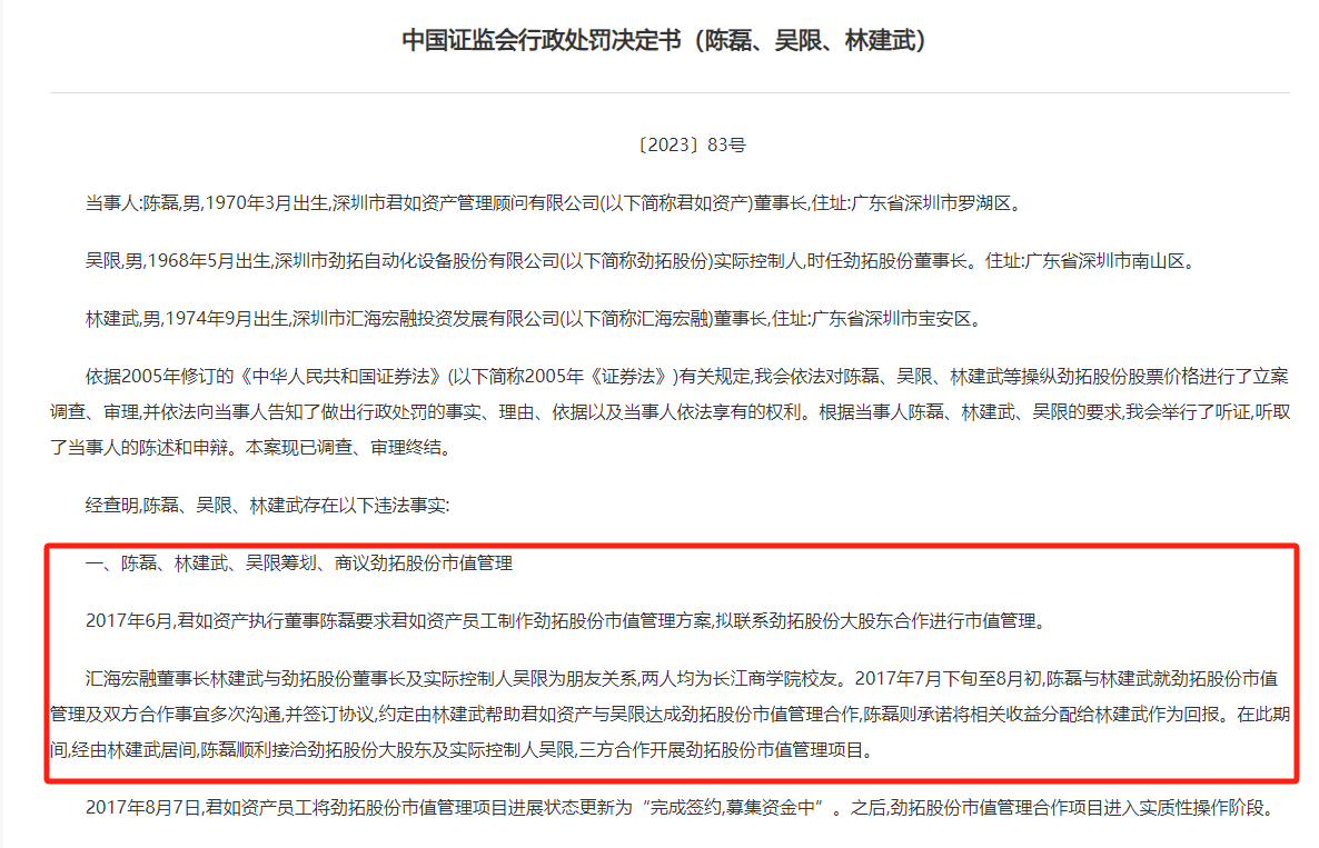 1月12日,证监会官网披露了两张罚单,因合谋操纵“劲拓股份”价格,君如资产董事长陈磊,劲拓股份实控人、时任劲拓股份董事长吴限,汇海宏融董事长林建武被没收违法所得共计1.65亿元,并处以4.96亿元的罚款,违法所得及罚款合计6.61亿元;陈磊和吴限分别被采取5年市场禁入措施。