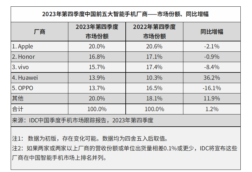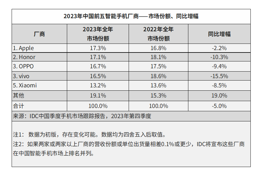 此外,IDC的数据显示,小米第四季度的成功主要在于其下滑幅度小于竞争对手。从全年来看,苹果2023年2.2%的销量降幅好于荣耀(Honor Device Co.)和Vivo等本土竞争对手——这两家公司都出现了两位数的下滑。总体出货量下降了5%。