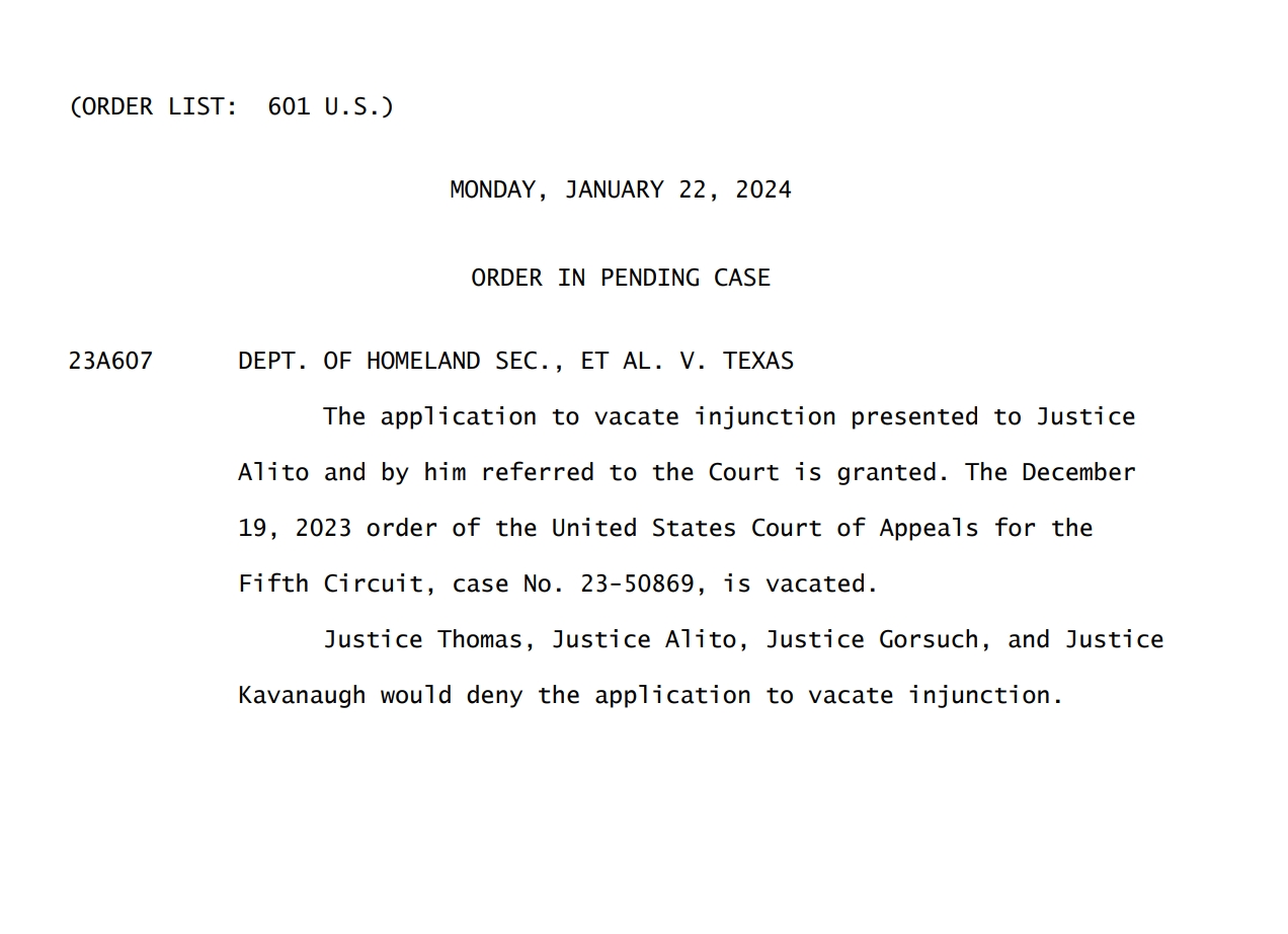 美国高院本周一发出的命令中,一共只有3句话:就国土安全部与得州政府的官司,美国高院撤销了下级法院发出的禁止令,9名大法官以5比4的投票做出了这一决定。