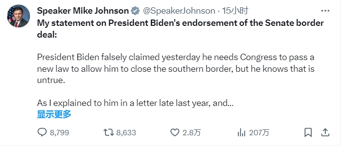 现任美国众议院议长约翰逊也强调,拜登在撒谎,他根本就不需要国会立法,就能动用行政令迅速加强边境管控。