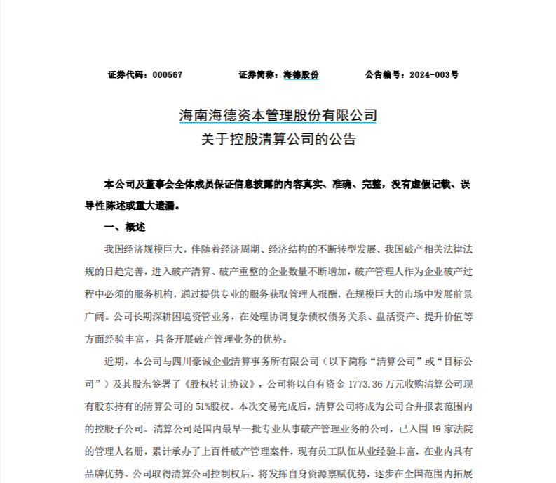 对于本次交易,北京市鑫诺律师事务所合伙人石小峰向财联社记者指出,海德股份作为持牌AMC机构,其日常业务多和不良资产处理有关,必然涉及大量的企业破产重组、资产评估清算。从业务整合的角度考虑,海德股份收购清算公司有望能够发挥协同效应,拓展盈利来源。