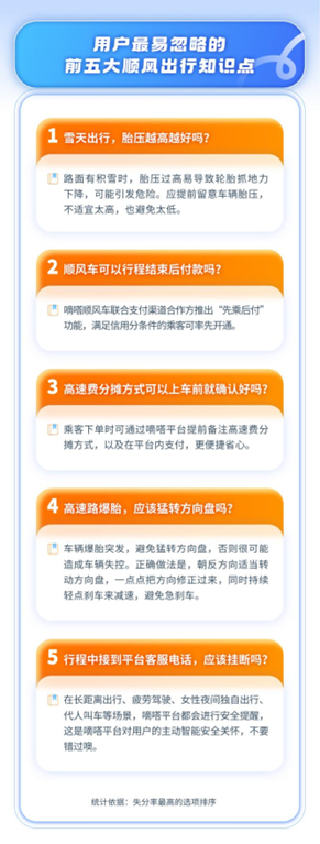 基于此次答题统计,用户最易忽略的前五大顺风出行知识点分别是:雪天出行,胎压应避免过高或过低;满足信用分条件的用户,可申请开通嘀嗒顺风车“先乘后付”新功能;对于高速费分摊方式,乘客在下单时即可通过平台提前备注,并于平台内支付;高速路爆胎,应避免猛转方向盘和急刹车;嘀嗒平台对用户会进行多场景主动智能安全关怀,行程中可放心接听嘀嗒平台客服电话。