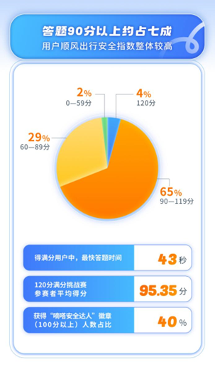 据结果统计,参与者近7000人,平均得分95.35分(满分120分),获得“嘀嗒安全达人”徽章(100分以上)人数占近四成,一定程度展现了用户顺风出行整体较高的安全意识和指数;在得满分用户中,最快答题时间为43秒,可见部分用户对出行安全知识和技能掌握相当熟练。